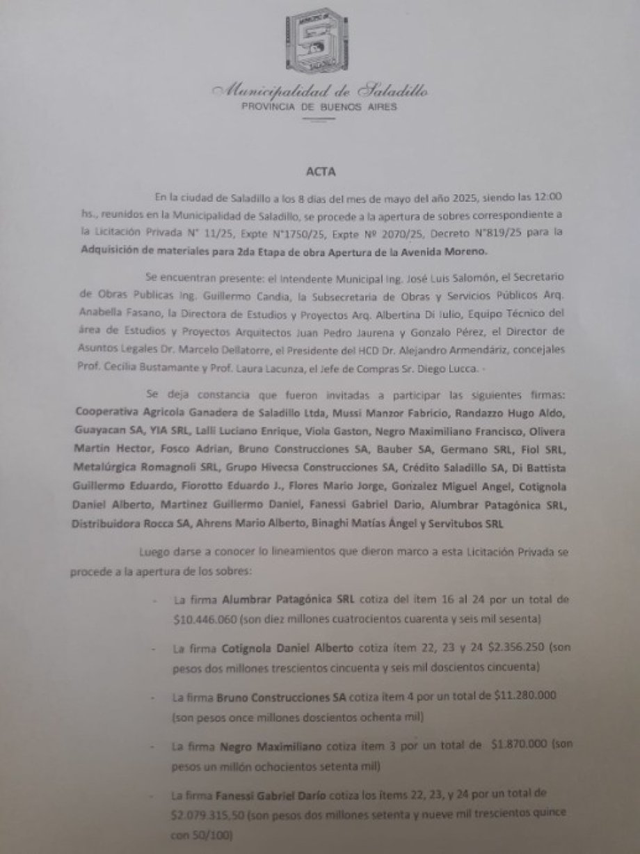 Se llevó a cabo la apertura de sobres de la Licitación Privada 25 de este año para la adquisición de materiales para la Segunda Etapa de obra de Apertura de la Avenida Moreno con un presupuesto oficial de 48.219.000 pesos.