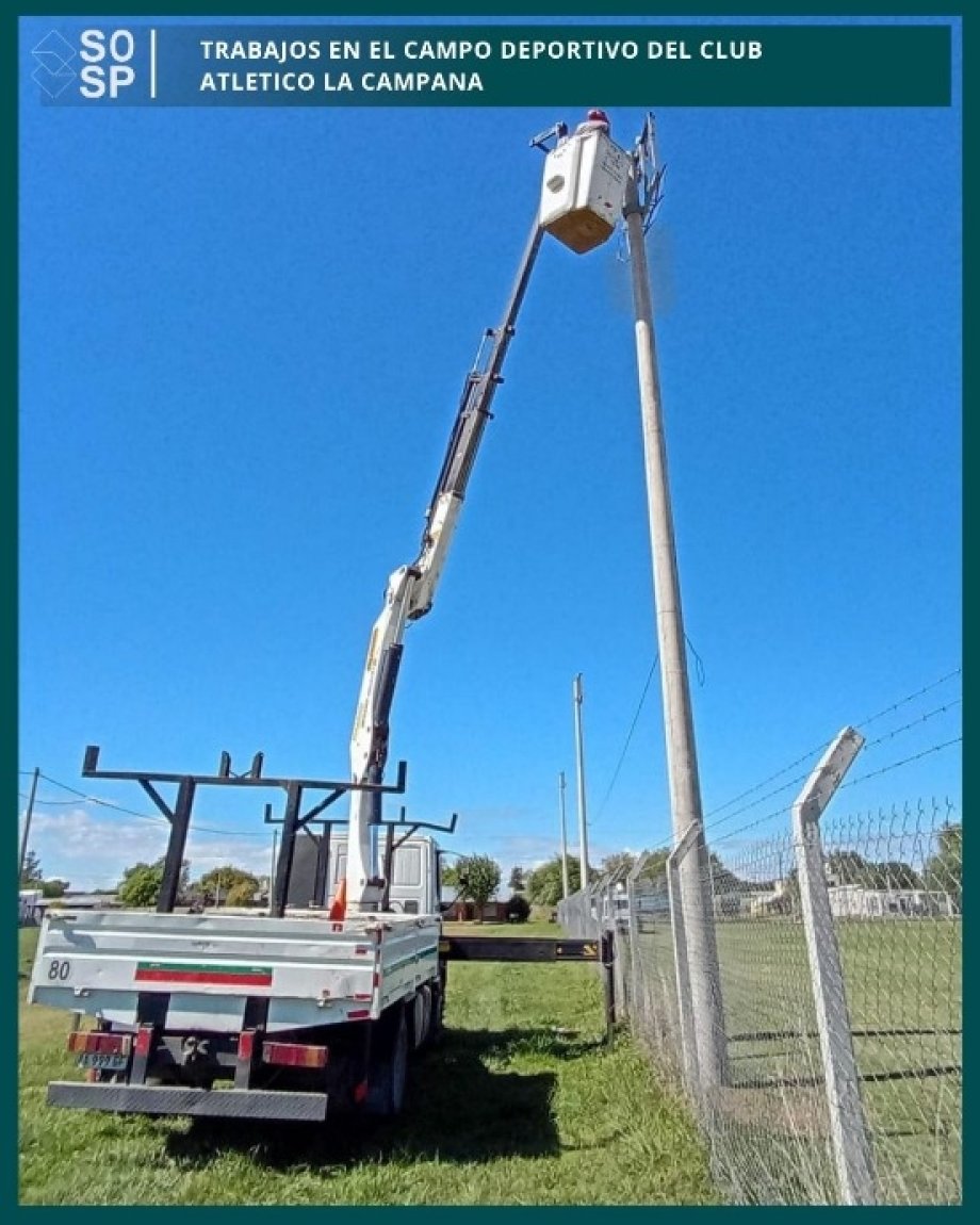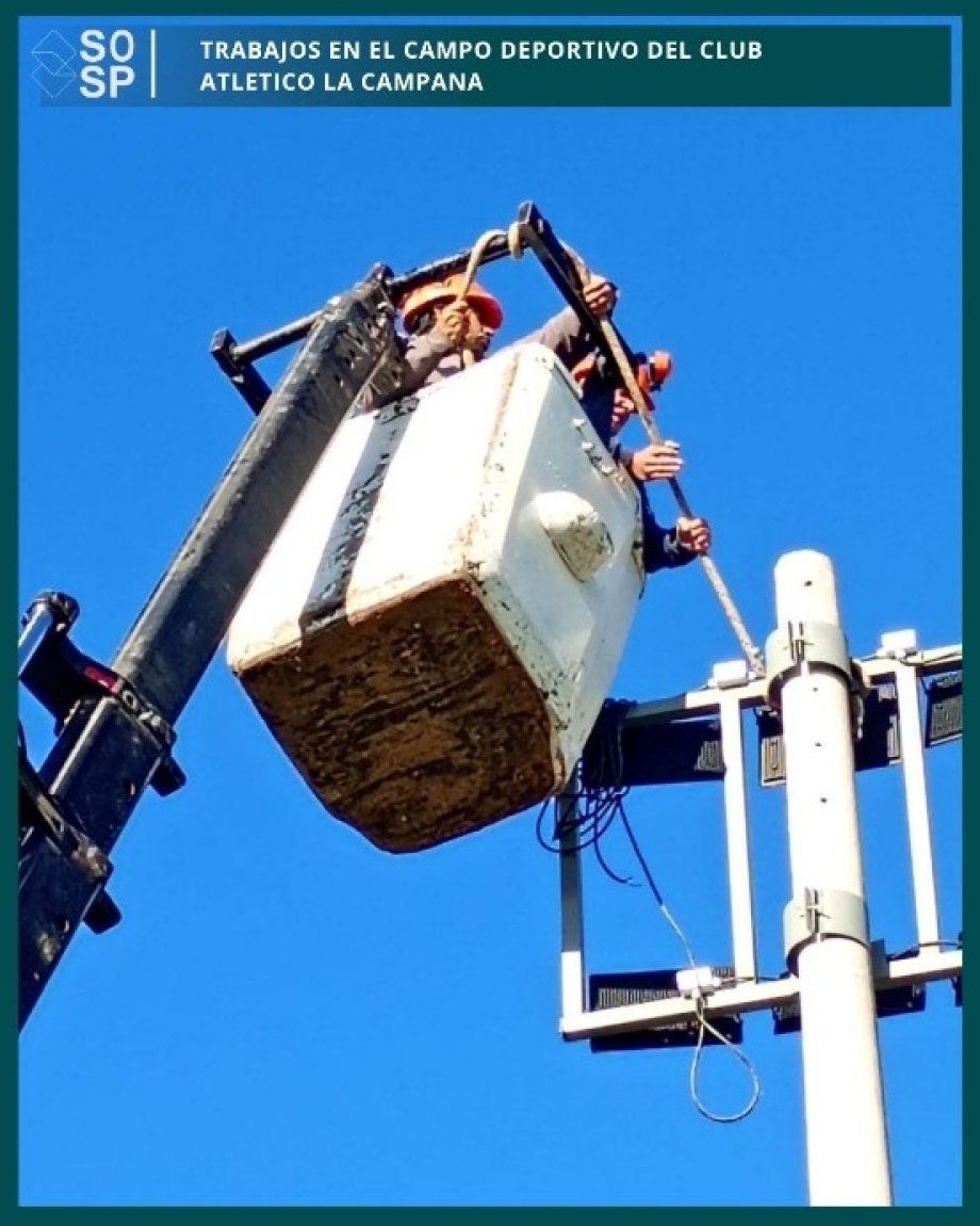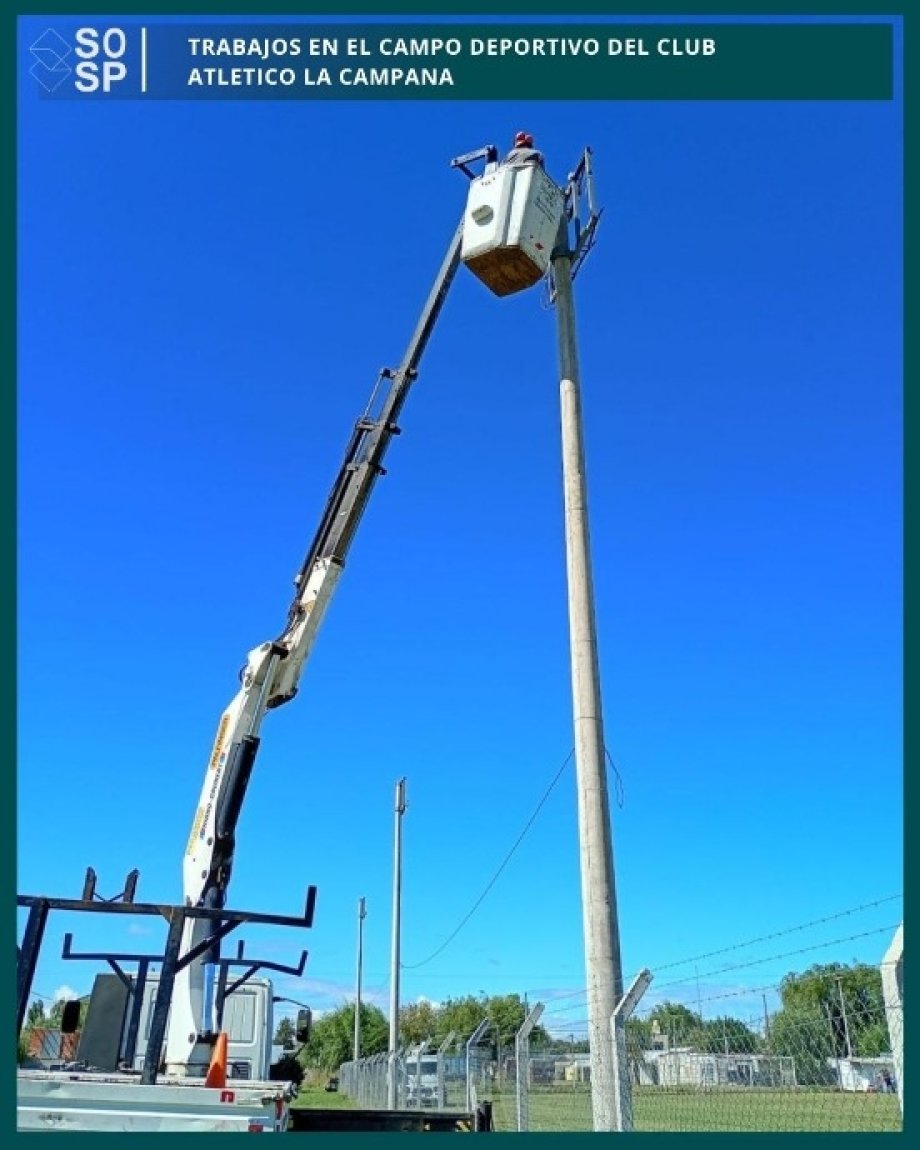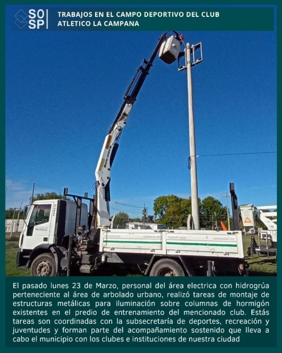 El pasado lunes 23 de marzo, personal del área eléctrica con hidrogrúa perteneciente al área de arbolado urbano, realizó tareas de montaje de estructuras metálicas para iluminación sobre columnas de hormigón existentes en el predio de entrenamiento del mencionado club. Estás tareas son coordinadas con la subsecretaría de deportes, recreación y juventudes y forman parte del acompañamiento sostenido que lleva a cabo el municipio con los clubes e instituciones de nuestra ciudad