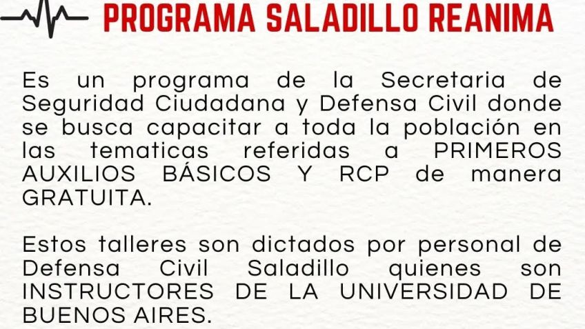 Desde Defensa Civil Saladillo continuamos con el Programa Saladillo Reanima, ofreciendo capacitaciones gratuitas en primeros auxilios básicos y RCP, dictadas por instructores certificados de la UBA.