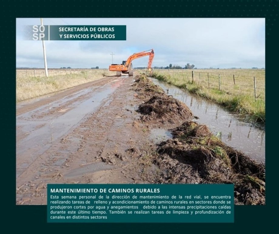 Esta semana personal de la dirección de mantenimiento de la red vial, se encuentra realizando tareas de relleno y acondicionamiento de caminos rurales en sectores donde se produjeron cortes por agua y anegamientos debido a las intensas precipitaciones caídas durante este último tiempo. También se realizan tareas de limpieza y profundización de canales en distintos sectores.