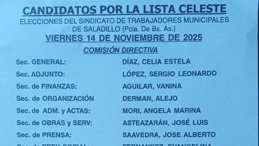 La Lista Celeste, encabezada por Celia Estela Díaz y la Lista Amarilla "Renovación Sindical, encabezada por Edith Mónica Tossici, competirán el próximo viernes 14 de noviembre para la elección de autoridades del Sindicato de Trabajadores Municipales en nuestra ciudad. El acto eleccionario se desarrollará en la sede del Sindicato, en la calle Hipólito Yrigoyen, entre avenida Belgrano y 12 de Octubre, entre las 08:00 y las 18:00.