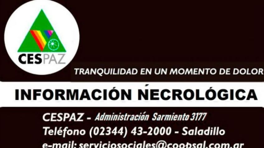 CESPAZ informa que falleció a la edad de 91 años, CARLOS FABBI. Sepelio el 22/05/2024 previo responso a las 17:00 en la Iglesia. Casa de duelo: ALEM Y ESTRADA - Departamento 9 - Saladillo