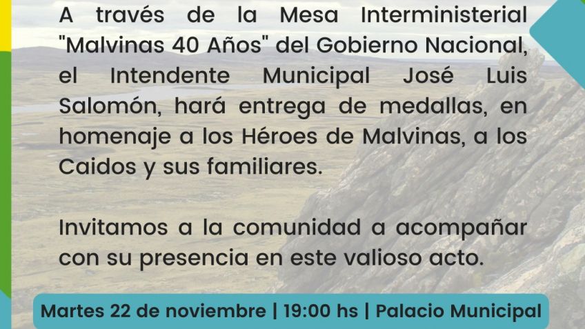 A través de la Mesa Interministerial "Malvinas 40 Años" del Gobierno Nacional, el Intendente Municipal José José Luis Salomón, hará entrega de medallas, en homenaje a los Héroes de Malvinas, a los Caídos y sus familiares.