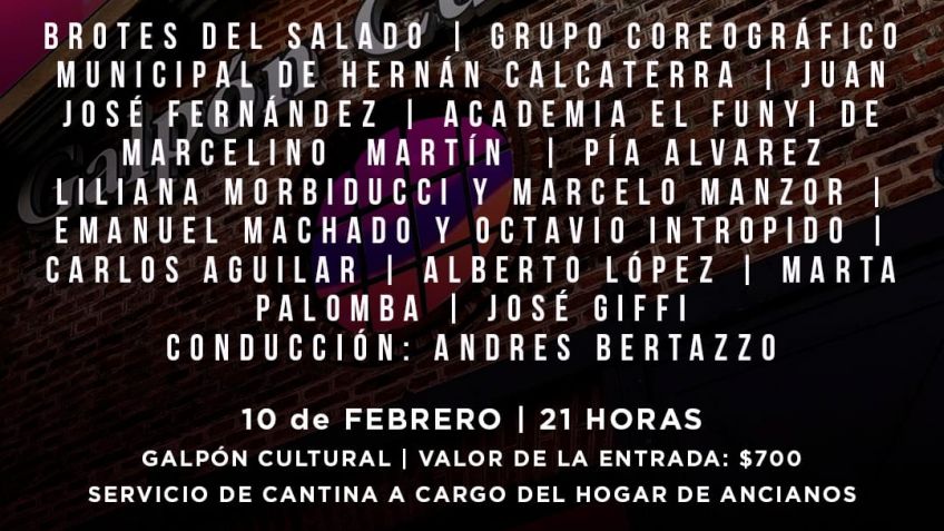 El 10 de febrero a las 21 horas en el Galpón Cultural se realizará el Festival Artístico a beneficio del Hogar de Ancianos, con la participación de Brotes del Salado, Grupo Coreográfico Municipal de Hernán Calcaterra, Juan José Fernández, Academia "El Funyi" de Marcelino Martín, Pía Álvarez, Liliana Morbiducci y Marcelo Manzor, Emanuel Machado y Octavio Intrópido, Carlos Aguilar, Alberto López, Marta Palomba y José Giffi, con la conducción de Andrés Bertazzo.