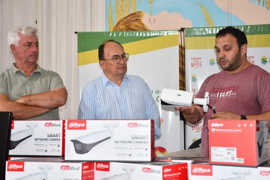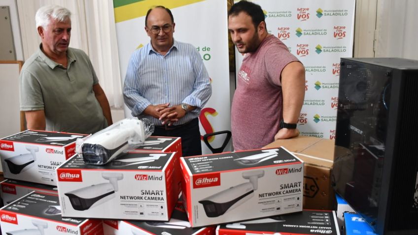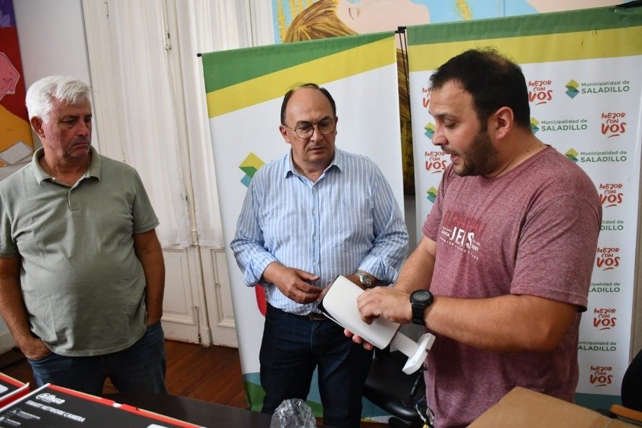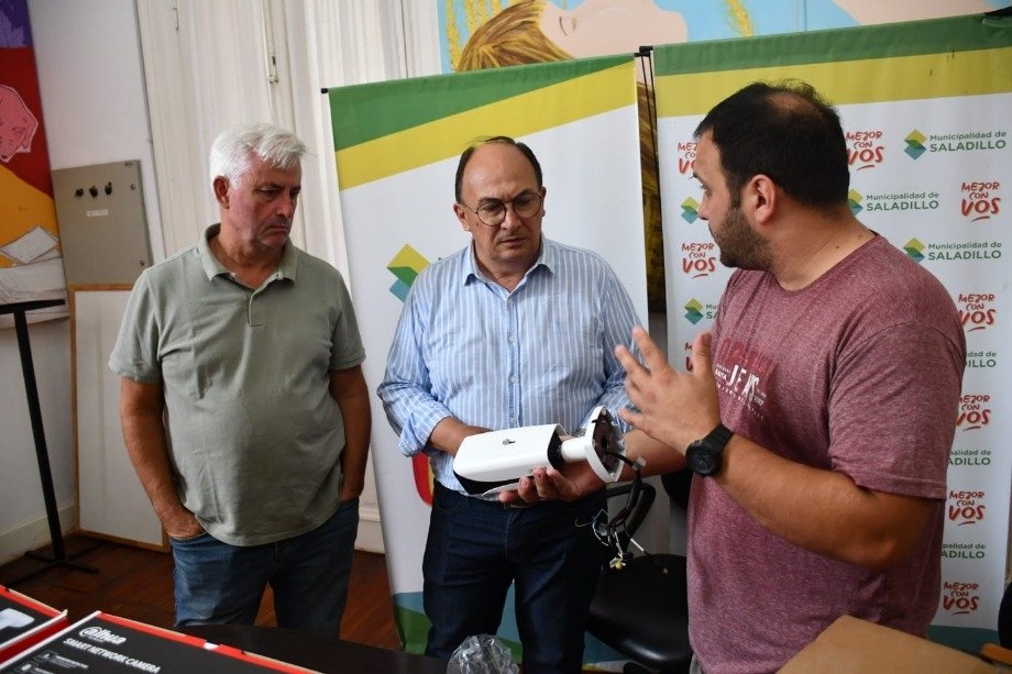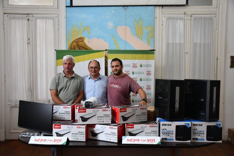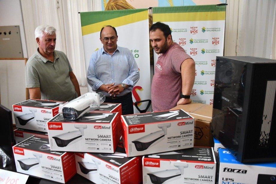 El Intendente Municipal Ing. José Luis Salomón junto con el Secretario de Seguridad Fernando Arrospide y el Técnico Maximiliano Santilli realizó la presentación de nuevo equipamiento de cámaras de seguridad y soporte técnico para el Centro de Monitoreo recientemente adquiridos previa licitación correspondiente con fondos del programa bonaerense de Fortalecimiento de la Seguridad.