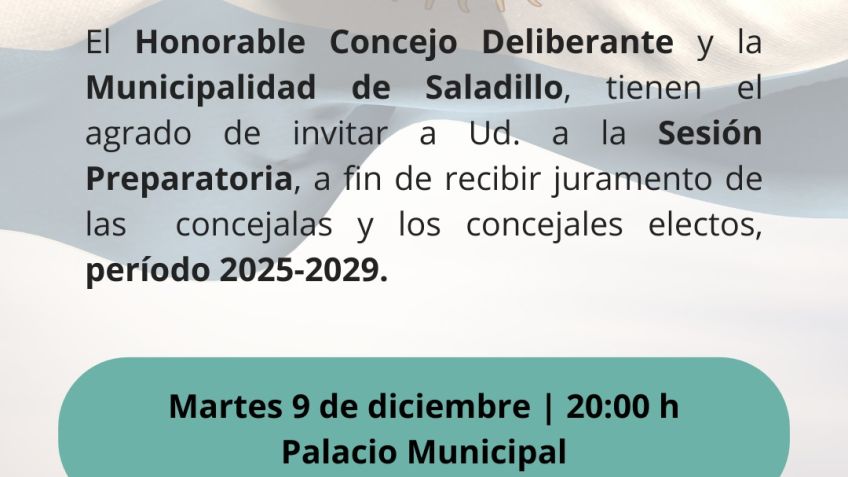 El Honorable Concejo Deliberante y la Municipalidad de Saladillo informan a la comunidad que el próximo martes 9 de diciembre, a las 20:00 hs, se llevará a cabo la Sesión Preparatoria en el Palacio Municipal.