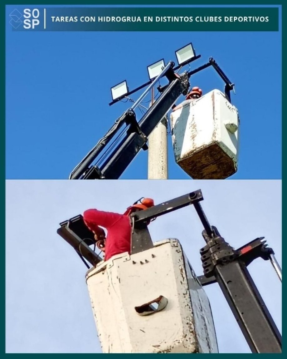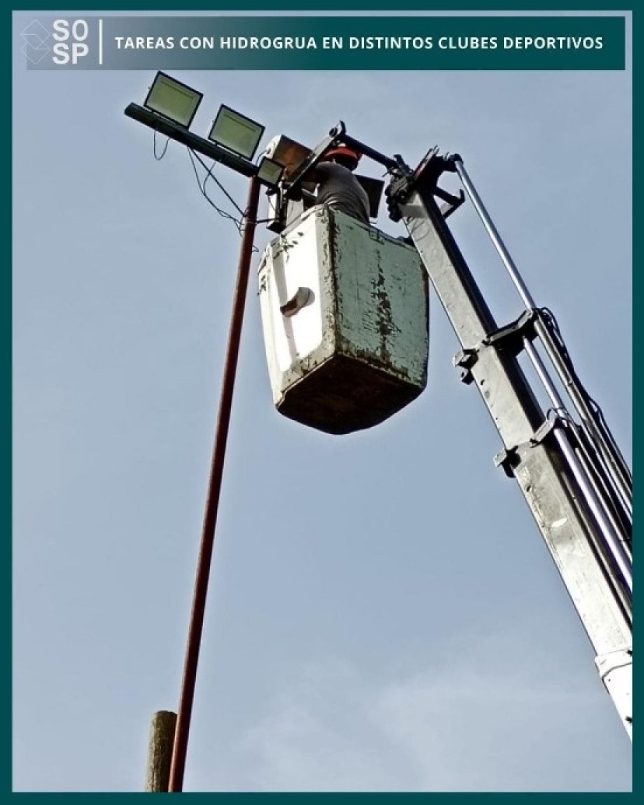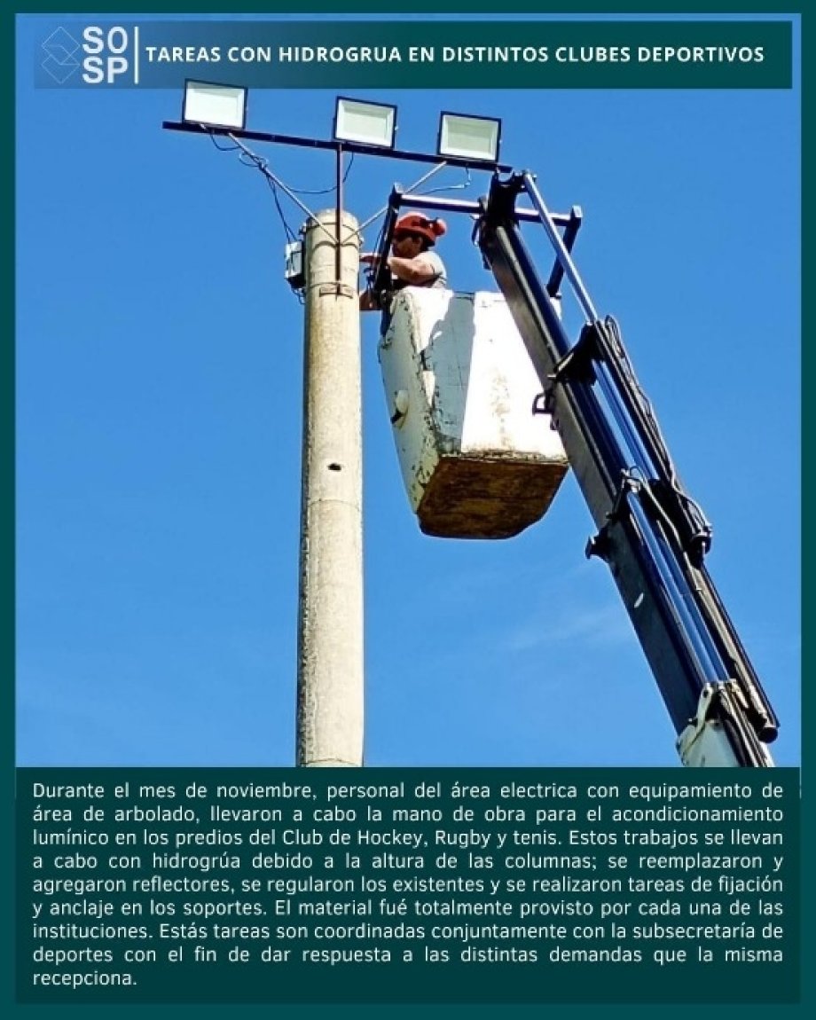 Durante el mes de noviembre, personal del área eléctrica con equipamiento de área de arbolado, llevaron a cabo la mano de obra para el acondicionamiento lumínico en los predios del Club de Hockey, Rugby y tenis. Estos trabajos se llevan a cabo con hidrogrúa debido a la altura de las columnas; se reemplazaron y agregaron reflectores, se regularon los existentes y se realizaron tareas de fijación y anclaje en los soportes. El material fué totalmente provisto por cada una de las instituciones. Estás tareas son coordinadas conjuntamente con la subsecretaría de deportes con el fin de dar respuesta a las distintas demandas que la misma recepciona.