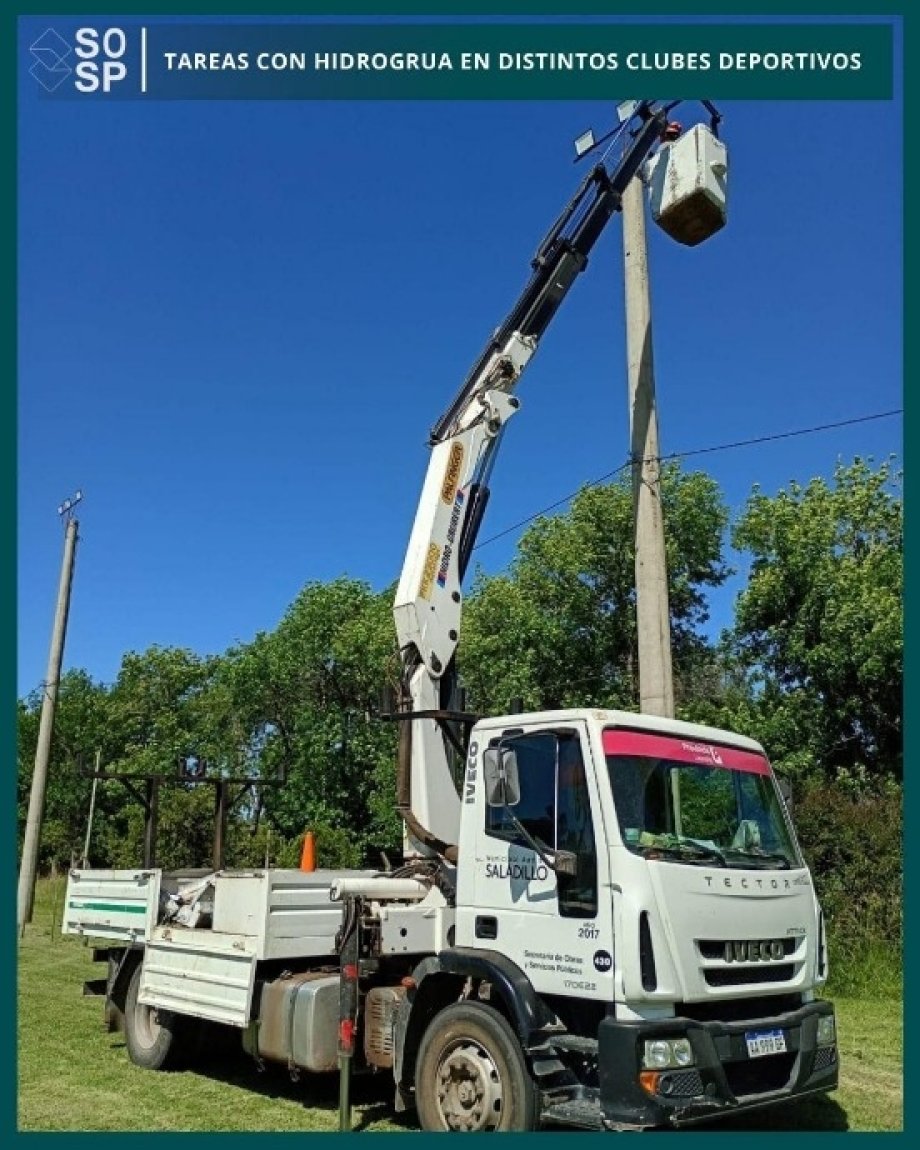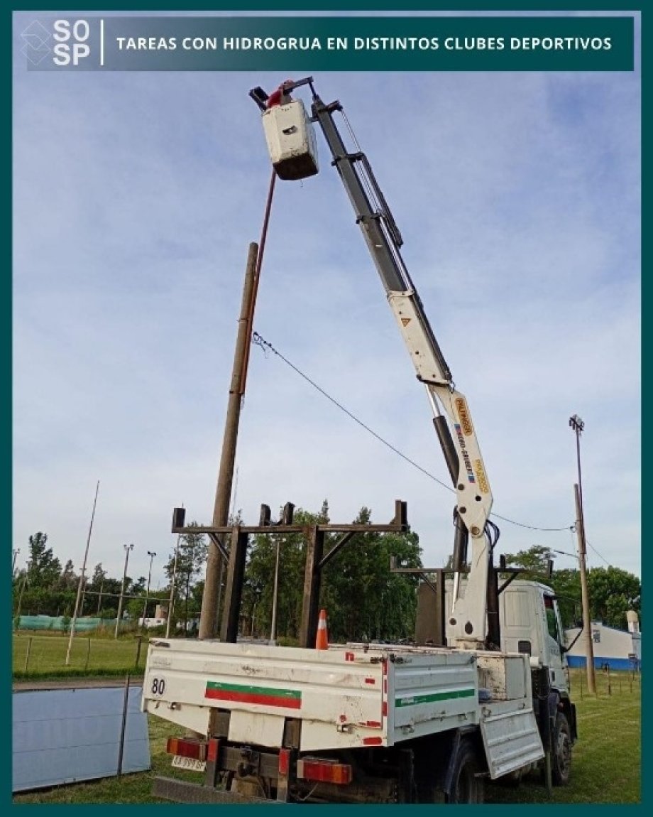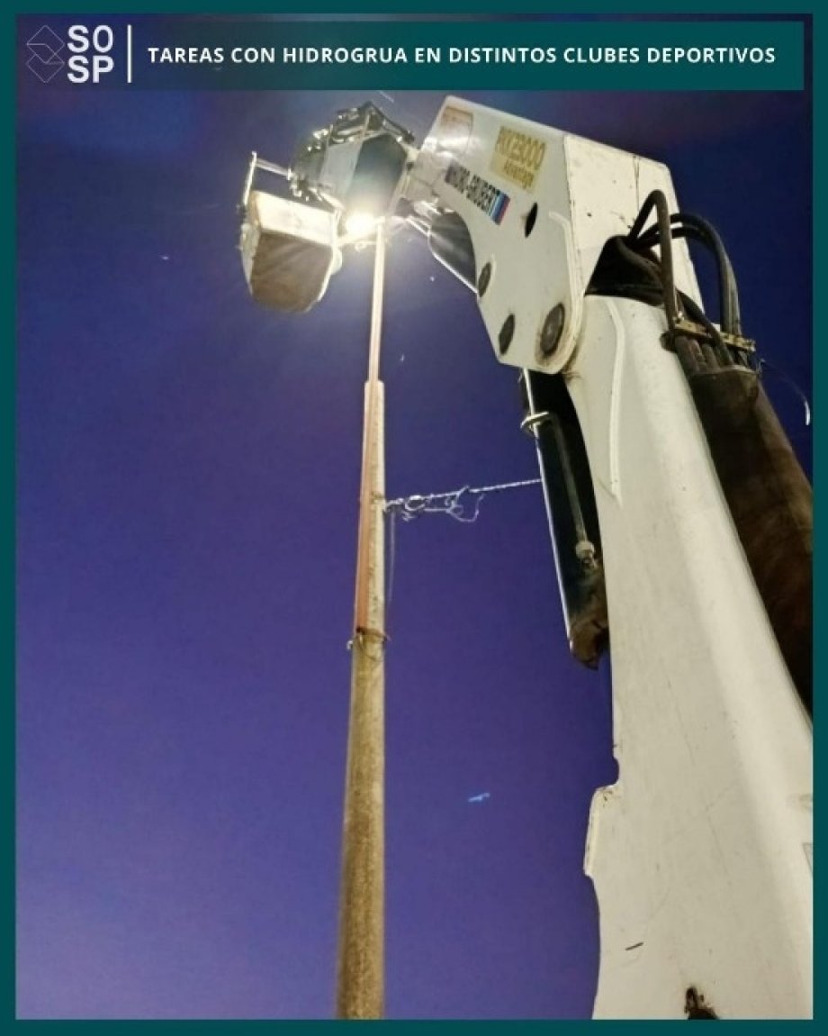 Durante el mes de noviembre, personal del área eléctrica con equipamiento de área de arbolado, llevaron a cabo la mano de obra para el acondicionamiento lumínico en los predios del Club de Hockey, Rugby y tenis. Estos trabajos se llevan a cabo con hidrogrúa debido a la altura de las columnas; se reemplazaron y agregaron reflectores, se regularon los existentes y se realizaron tareas de fijación y anclaje en los soportes. El material fué totalmente provisto por cada una de las instituciones. Estás tareas son coordinadas conjuntamente con la subsecretaría de deportes con el fin de dar respuesta a las distintas demandas que la misma recepciona.