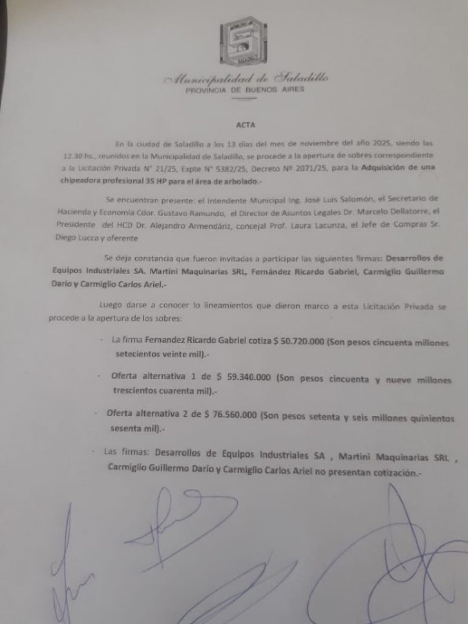 En el Salón Sesquicentenario se realizó la apertura de sobres correspondiente a la Licitación Privada 21 de este año para la adquisición de una chipeadora profesional de 35 hp para el Área de Arbolado Urbano.