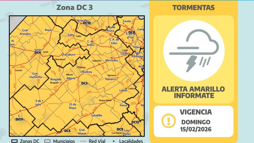 Entre la madrugada y la mañana del domingo 15 se espera que los municipios en amarillo se vean afectados de oeste a este por lluvias y tormentas de variada intensidad. Algunas pueden ser localmente fuertes, acompañadas principalmente por frecuente actividad eléctrica, chaparrones intensos de corta duración, y además por ocasional caída de granizo y ráfagas localmente fuertes. Se prevén valores de precipitación acumulada entre 15 y 50 mm, que pueden ser superados en forma puntual. Se estima que los mayores acumulados para este día se den en el centro y norte de la provincia ( Zonas DC 1, 2, 3, 4, 5, 8 ,9, 10, 11 y 12, incluido AMBA)