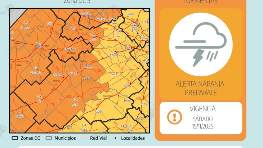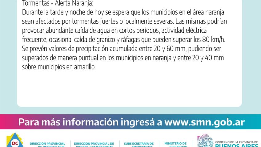 Sábado 15: Se esperan lluvias y tormentas de variada intensidad a partir de las 21-22 hs, avanzando de oeste a este. Algunas pueden ser localmente fuertes y estar acompañadas de abundante caída de precipitación en corto tiempo, intensa actividad eléctrica, ocasional caída de granizo y ráfagas de viento que pueden alcanzar o superar los 80 km/h, en especial sobre zona DC 10 entre las 20 y 24 hs.