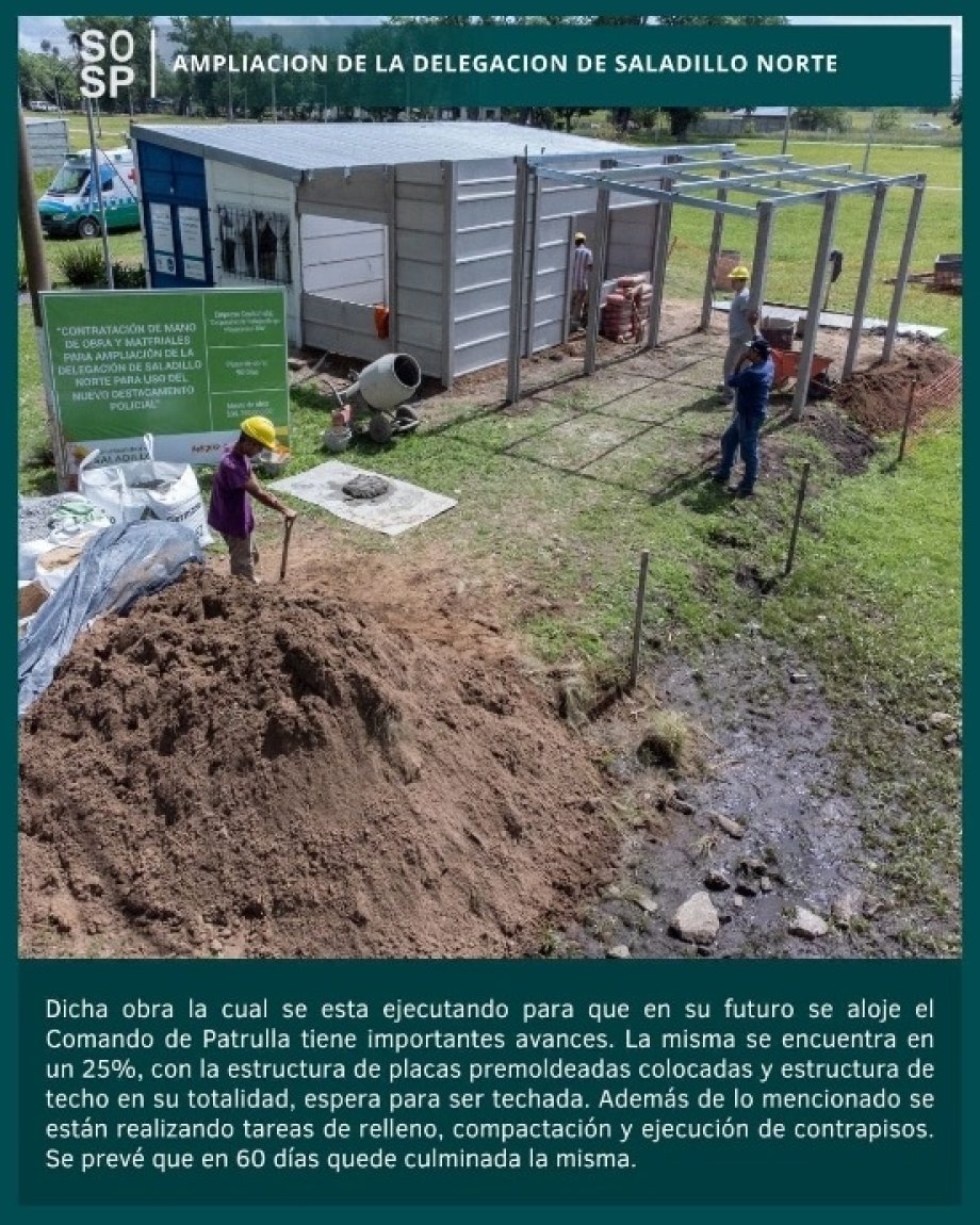 Dicha obra la cual se esta ejecutando para que en su futuro se aloje el Comando de Patrulla tiene importantes avances. La misma se encuentra en un 25%, con la estructura de placas premoldeadas colocadas y estructura de techo en su totalidad, espera para ser techada. Además de lo mencionado se están realizando tareas de relleno, compactación y ejecución de contrapisos. Se prevé que en 60 días quede culminada la misma.