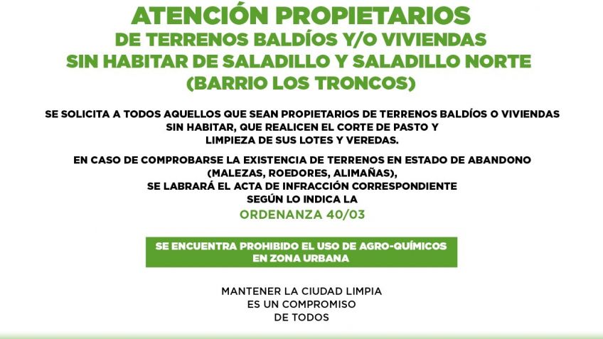 Se solicita a todos aquellos que sean propietarios de terrenos baldíos o viviendas sin habitar, que realicen el corte de pasto y limpieza de sus lotes y veredas.