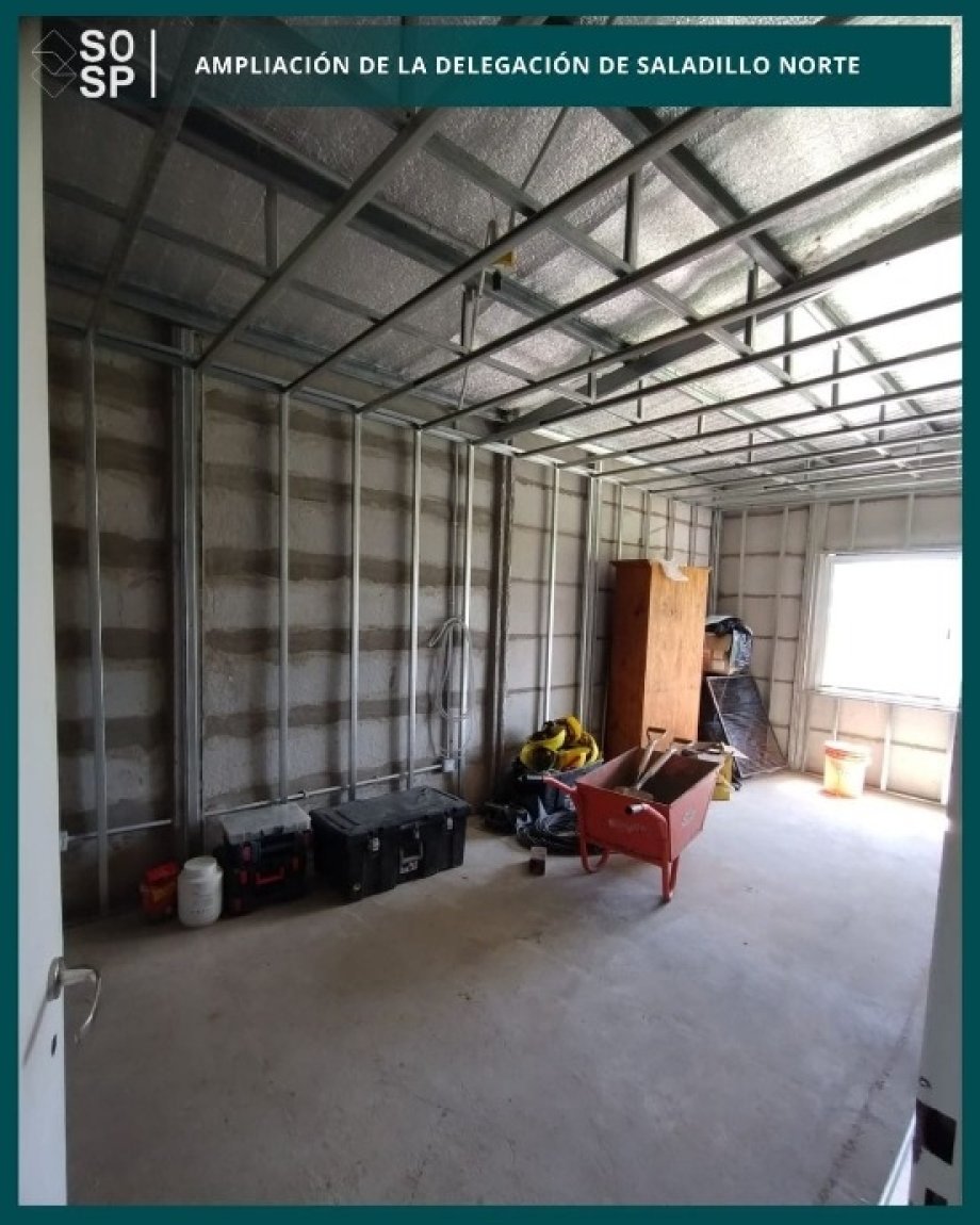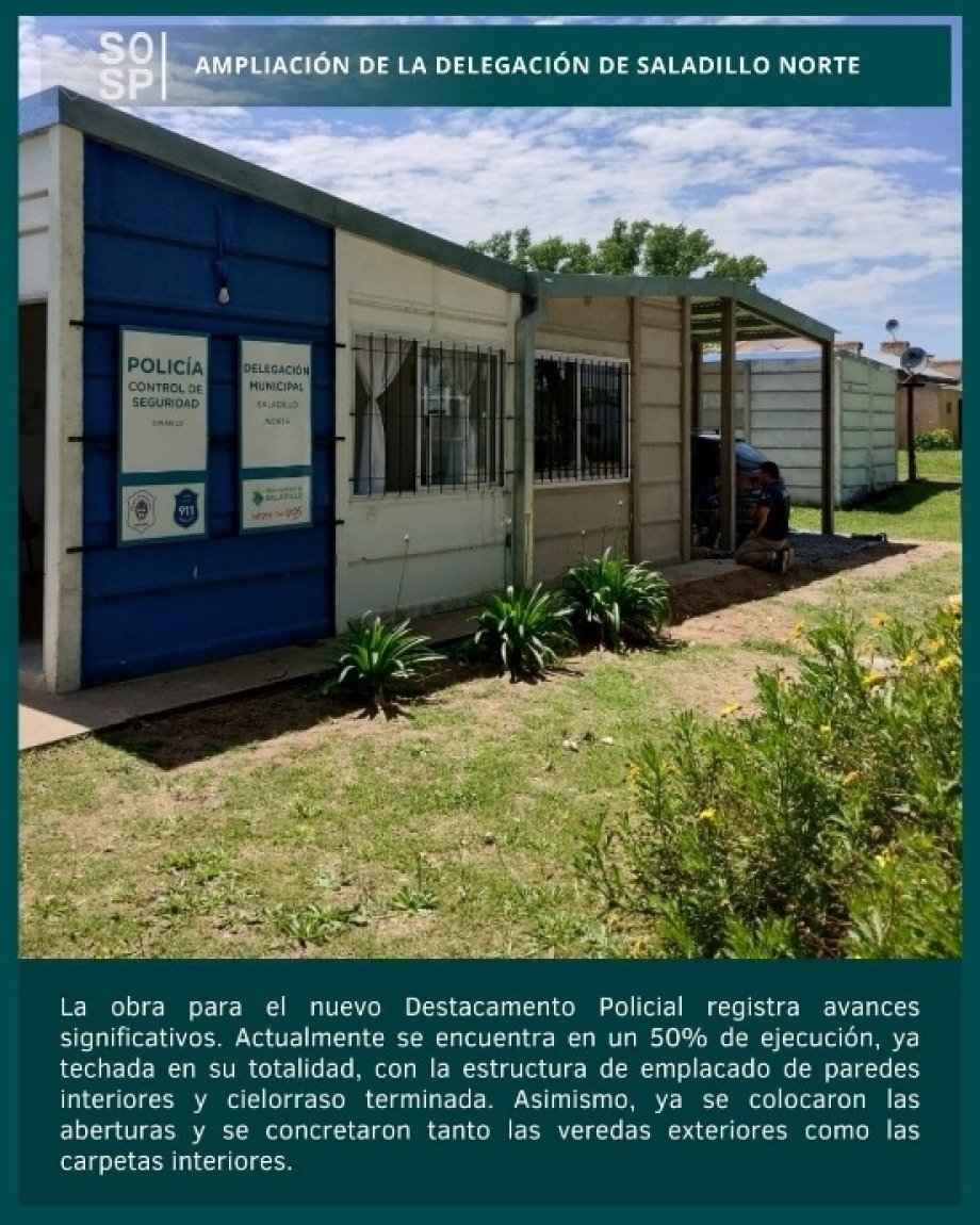 La obra para el nuevo Destacamento Policial registra avances significativos. Actualmente se encuentra en un 50% de ejecución, ya techada en su totalidad, con la estructura de emplacado de paredes interiores y cielorraso terminada. Asimismo, ya se colocaron las aberturas y se concretaron tanto las veredas exteriores como las carpetas interiores.