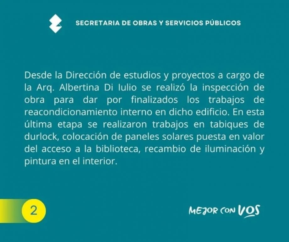 Desde la Dirección de estudios y proyectos a cargo de la Arq. Albertina Di Iulio se realizó la inspección de obra para dar por finalizados los trabajos de reacondicionamiento interno en dicho edificio. En esta última etapa se realizaron trabajos en tabiques de durlock, colocación de paneles solares puesta en valor del acceso a la biblioteca, recambio de iluminación y pintura en el interior.