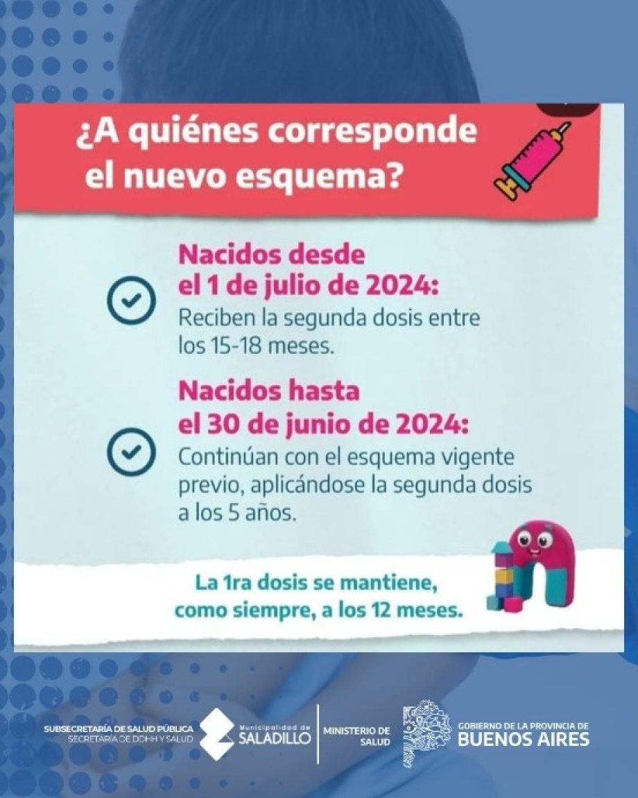 El nuevo esquema alcanza a niñas y niños nacidos desde el 1 de julio de 2024, mientras que quienes hayan nacido hasta el 30 de junio de 2024 continúan con el esquema vigente previo, recibiendo la segunda dosis a los 5 años. La primera dosis se mantiene sin cambios, aplicándose como siempre a los 12 meses de edad.