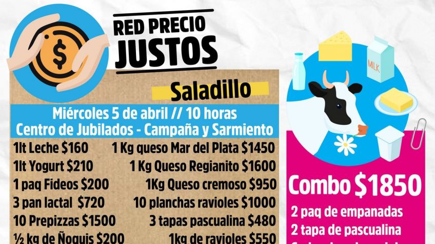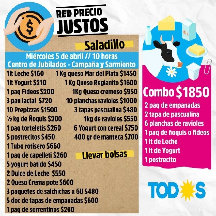Este miércoles 5 de abril estará el Camión de pastas y lácteos de la Red de Precios Justos en el Centro de Jubilados San Roque, Campaña y Sarmiento, Barrio 272 viviendas.