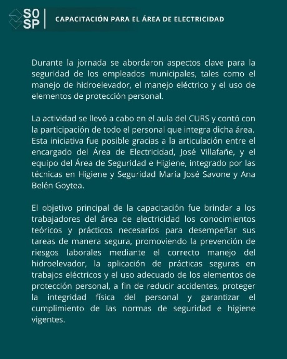 El objetivo principal de la capacitación fue brindar a los trabajadores del área de electricidad los conocimientos teóricos y prácticos necesarios para desempeñar sus tareas de manera segura, promoviendo la prevención de riesgos laborales mediante el correcto manejo del hidroelevador, la aplicación de prácticas seguras en trabajos eléctricos y el uso adecuado de los elementos de protección personal, a fin de reducir accidentes, proteger la integridad física del personal y garantizar el cumplimiento de las normas de seguridad e higiene vigentes.