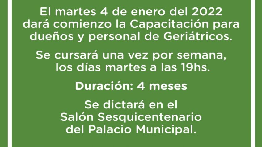 El martes 4 de enero del 2022 dará comienzo la Capacitación para dueños y personal de Geriátricos.