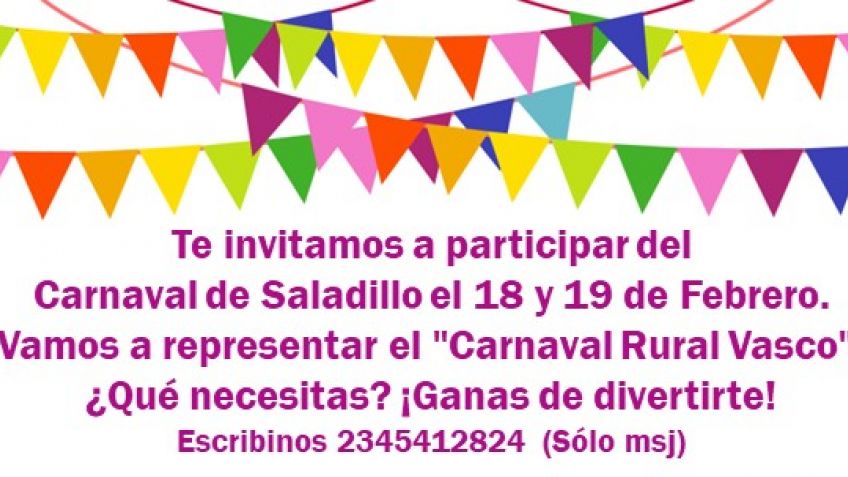 El Centro Vasco Itxaropen te invita a participar del Carnaval de Saladillo donde representará el Carnaval Rural Vasco. ¿Qué necesitás? Ganas de divertirte. Escribinos al 2345-412824, sólo mensajes.