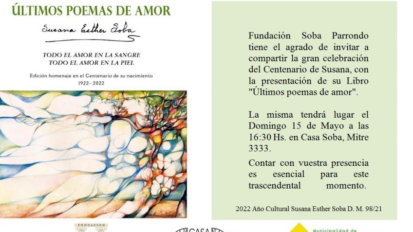 Fundación Soba Parrondo tiene el agrado de invitar a compartir la gran celebración del Centenario de Susana, con la presentación de su Libro "Últimos poemas de amor".