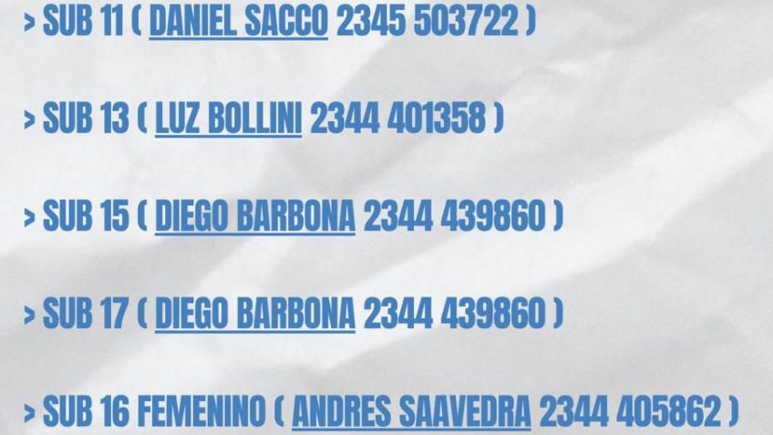 Asimismo, el club invita a sumarse a la pretemporada de las distintas categorías: Sub 11 (Daniel Sacco - 2345 503722), Sub 13 (Luz Bollini - 2344 401358), Sub 15 y Sub 17 (Diego Barbona - 2344 439860) y Sub 16 Femenino (Andrés Saavedra - 2344 405862).