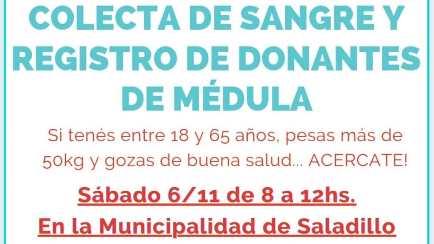 Sábado 6 de noviembre de 8 a 12hs. en la Municipalidad de Saladillo.