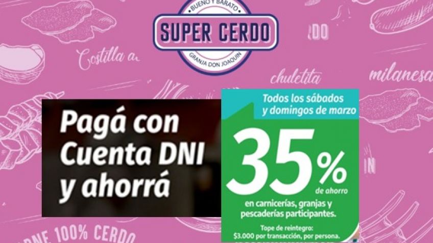 Todos los sábados y domingos de marzo pagá en Súper Cerdo con Cuenta DNI con 35 por ciento de descuento en Bartolomé Mitre y avenida Cabral y en nuestra sucursal de Prolongación avenida Moreno y Colectora ruta nacional 205.