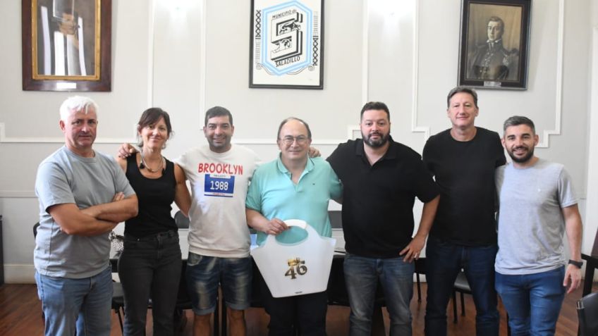 El Intendente Municipal Ing. José Luis Salomón junto con la Secretaria de Desarrollo Local Victoria Irañeta, el Secretario de Seguridad Fernando Arrospide, el Director de Juventudes Bernabé Ruviera y el Concejal Vladimir Wuiovich recibió a los organizadores de la vigésima edición de la fiesta La 46 que tuvo lugar el primer día de este año 2026 en el estadio del Club Atlético Argentino.