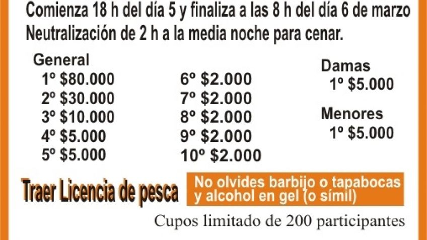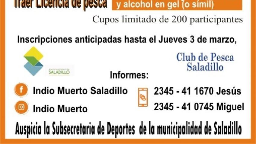 Organizado por el Club De Pesca Saladillo y con el auspicio de la Subsecretaría de Deportes y Recreación se llevará a cabo en nuestra ciudad un importante concurso de pesca variada de 12 horas.