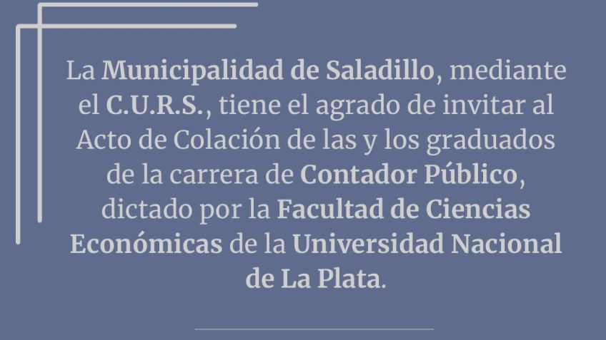 La Municipalidad de Saladillo, a través del C.U.R.S., acompaña y celebra a las y los graduados de Contador Público, de la Facultad de Ciencias Económicas de la UNLP, en un momento que marca el cierre de una etapa y el comienzo de nuevos desafíos profesionales.