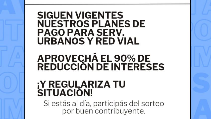 Aprovecha nuestros planes de pago con reducción de hasta el 90% en intereses en tus tasas de Servicios Urbanos y Red Vial, podes incluir todas las deudas al 31 de diciembre y quedar al día.