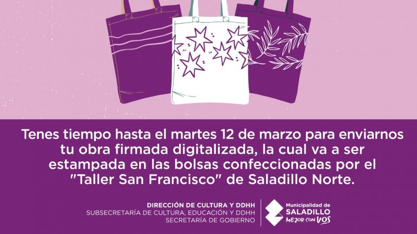 Tenes tiempo hasta el martes 12 de marzo para enviarnos tu obra firmada digitalizada, la cual va a ser estampada en las bolsas confeccionadas por el "Taller San Francisco" de Saladillo Norte.