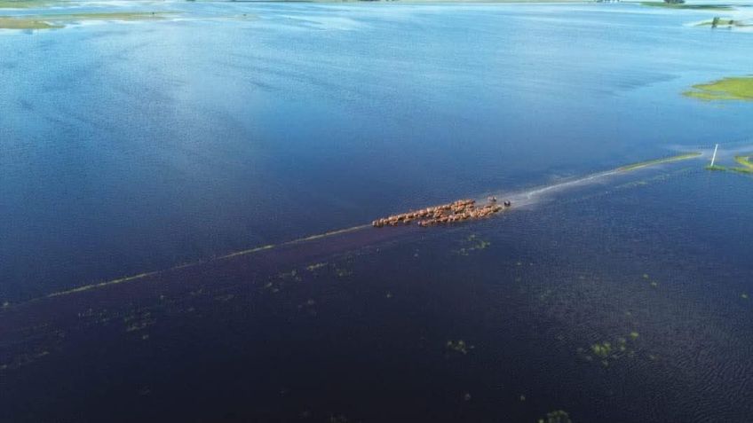 Ante la crecida del Arroyo Vallimanca tras las últimas lluvias, productores de la zona del Paraje La 43 comienzan a trasladar sus animales para ponerlos a salvo.