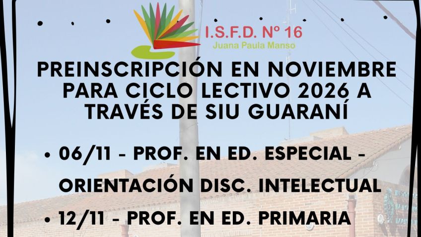 En esta oportunidada queremos informar a toda la comunidad de Saladillo como así también de la región, que el ISFD 16 ha sido seleccionado por la DGCyE de la Provincia de Buenos Aires para la implementación del SIU GUARANÍ en la preinscripción a las carreras de Profesorados para el ciclo lectivo 2026, motivo por el cual nos resulta de suma importancia compartir esta información: