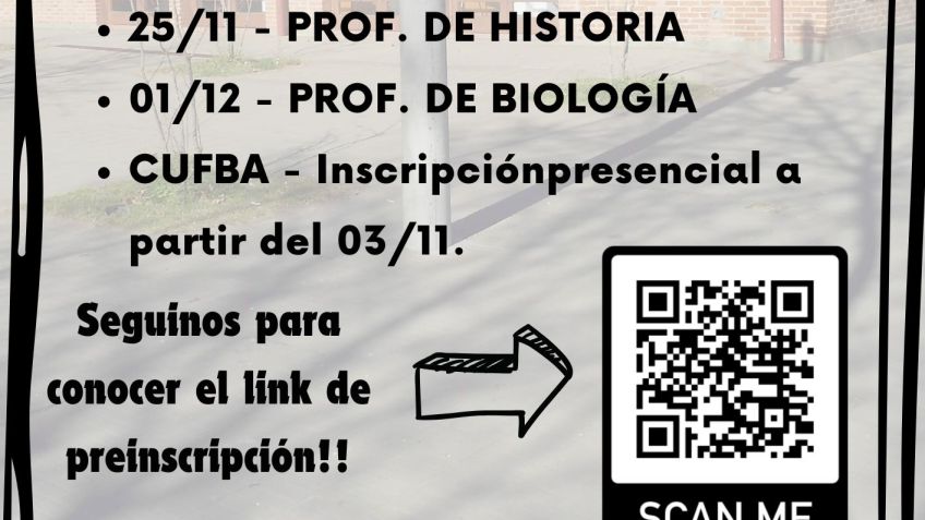 25/11, a las 9:00 am, abre la preinscripción para el Profesorado de Historia. Se cursa en turno vespertino.