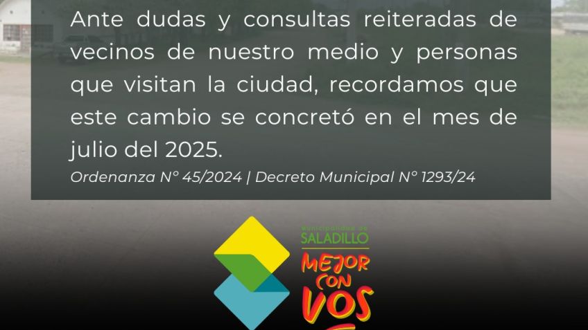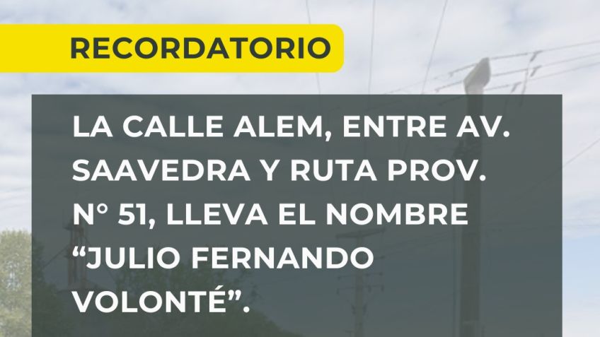Desde la Municipalidad de Saladillo recordamos que la calle Alem, en el tramo comprendido entre Saavedra y la Ruta Provincial Nº 51, cambió su denominación y actualmente lleva el nombre de Julio Fernando Volonté.
