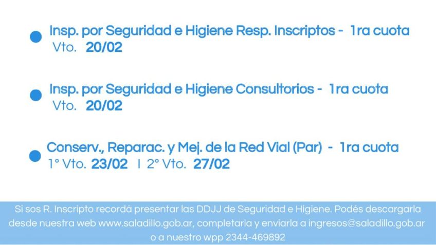 Si sos R. Inscripto recordá presentar las DDJJ de Seguridad e Higiene. Descargala desde nuestra web www.saladillo.gob.ar, completala y enviala a ingresos@saladillo.gob.ar o a nuestro wpp 2344-469892