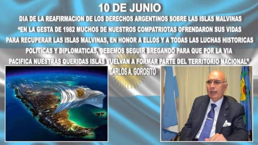 "El 10 de junio de 1829, el Gobernador de Buenos Aires Gral. Martin Rodríguez tomó una decisión soberana con la creación Comandancia Política y Militar de las Malvinas, Islas y Sector Antártico y pone al frente de la misma a Don Luis Vernet. Hoy como siempre decimos que Malvinas es una causa Nacional y que nuestro compromiso es seguir luchando por la vía diplomática para recuperar esa parte irredenta de nuestro territorio nacional", dijo Carlos Antonio Gorosito.