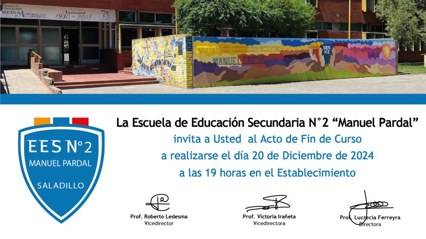 Invitamos a toda la comunidad al acto de cierre del ciclo lectivo y entrega de diplomas que se desarrollará el próximo viernes 20 de diciembre, a las 19:00, en sede del establecimiento.