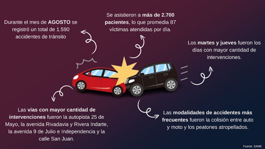 Además, las principales zonas afectadas por los accidentes de tránsito en Buenos Aires incluyen las comunas 1, 7 y 9, con barrios como Retiro, San Nicolás y Liniers entre los más perjudicados. En tanto, las vías con mayor cantidad de intervenciones incluyen la autopista 25 de Mayo, la avenida Rivadavia, la avenida 9 de Julio y la calle San Juan, entre otras; siendo las modalidades de accidentes más frecuentes las colisiones entre autos y motos, así como los atropellos de peatones.