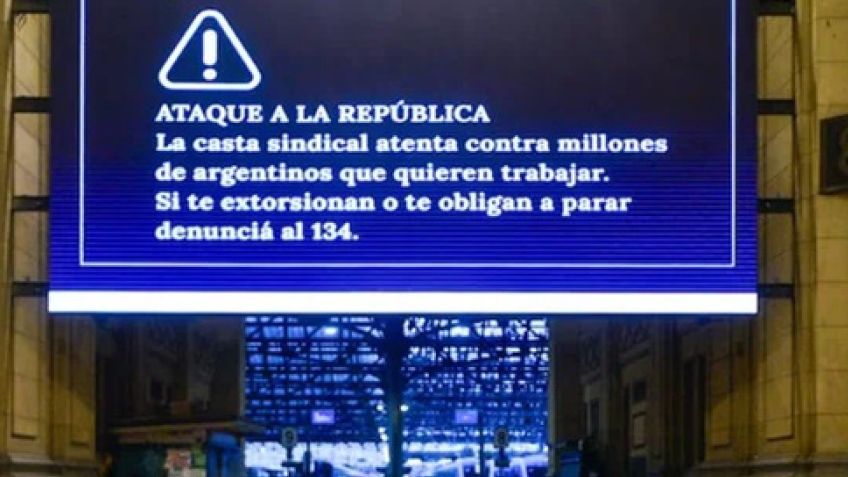 "Ataque a la República. La casta sindical atenta contra millones de argentinos que quieren trabajar. Si te extorsionan o te obligan a parar denuncia al 134", fue el mensaje que mostraron las pantallas de las estaciones de trenes en el Área Metropolitana de Buenos Aires (Amba) y que se repetía por altoparlante este jueves por la mañana en el inicio del tercer paro general contra el gobierno de Javier Milei. Tal como ocurre ante cada reclamo por la pauperización de las condiciones de vida, ya sea de trabajadores o jubilados, el gobierno nacional optó por responder con violencia e intimidación.El propio vocero presidencial Manuel Adorni, candidato a legislador de la Ciudad de Buenos Aires por La Libertad Avanza, el partido oficialista a nivel nacional, compartió orgulloso un video en el que se puede ver y oir el mensaje que solo alienta a la división y al agrietamiento de la sociedad.
