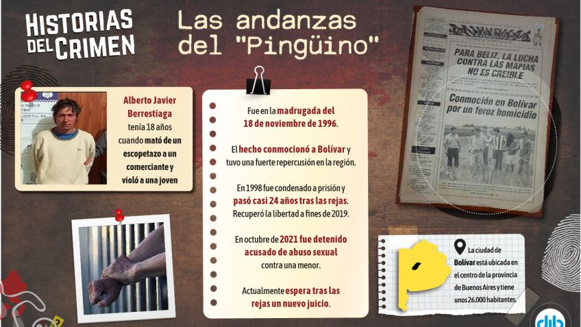 Cuando el 31 de octubre de 1996 Alberto Javier Berrestiaga festejó su cumpleaños 18 no sabía que iba a ser uno de los últimos que pasaría en libertad. Tres días antes había cometido un robo, fue a la ciudad de Azul a declarar ante la Justicia y volvió a Bolívar. Ya tenía cierto prontuario sobre su espalda, pero su condición de menor de edad lo favorecía. Sin embargo, el 18 de noviembre, "el Pingüino", sobrenombre heredado y por el que era conocido en el barrio, fue por más. Tras ingresar a robar a una casa, mató a un hombre, luego tomó de rehenes a una pareja, violó a una mujer y escapó. Pero fue encontrado rápidamente y condenado. De ese hecho que sacudió a Bolívar, se cumplen 25 años, y las andanzas del "Pingüino", que recuperó la libertad en 2019, volvieron a la luz hace poco, con una nueva detención.
