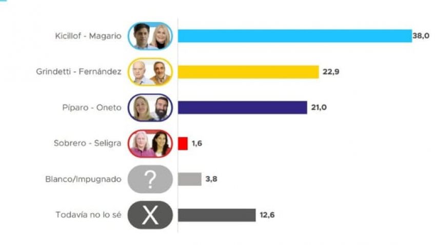La consultora Proyección dio a conocer su última encuesta electoral centrada en la provincia de Buenos Aires. Según los datos dados a conocer, el actual gobernador Axel Kicillof aumentaría el caudal de votos con respecto a las Paso y llegaría al 38%. Por el contrario, Néstor Grindetti, candidato de Juntos Por el Cambio, bajaría hasta el 22,9% y vería amenazado su papel de principal figura opositora, ya que la candidata de La Libertad Avanza, Carolina Píparo sería apoyada por un 21% del electorado.