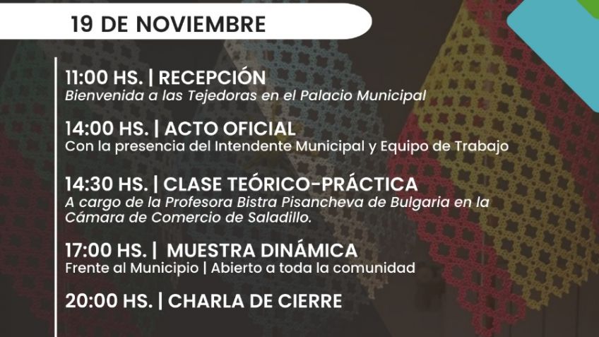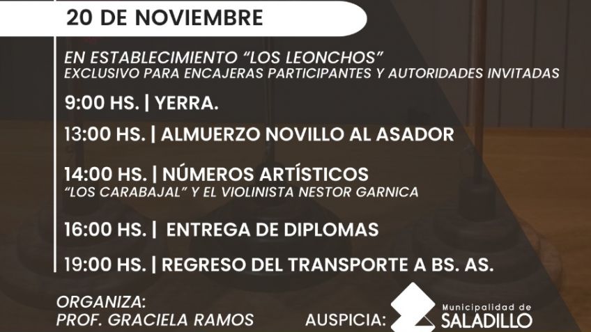 Invitamos a la comunidad a acompañar este hecho, ya que llegarán a Saladillo muchos visitantes. Especialmente los esperamos el día sábado por la tarde frente al Palacio Municipal, ya que se llevará a cabo una muestra dinámica de tejido a bolillo.