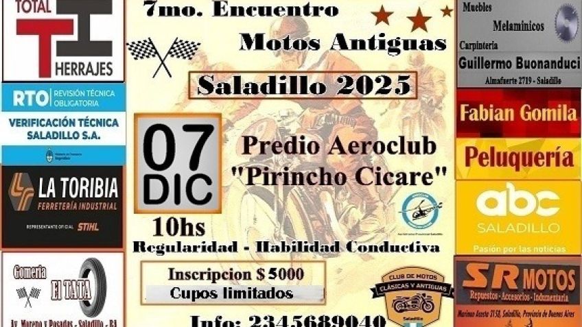 Organizado por el club de Motos Clásicas y Antiguas de Saladillo, se llevará a cabo el domingo 7 de diciembre el Séptimo Encuentro y Rally de Motos Antiguas. El mismo tendrá como base el Aeroclub Augusto Cicaré de Saladillo y será con entrada libre y gratuita.