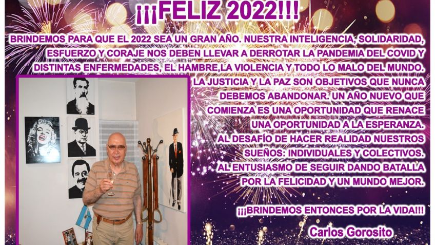 "Al mundo le falta un tornillo / Que venga un mecánico / Pa' ver si lo puede arreglar. Esa frase pertenece a la letra del tango 'Al mundo le falta un tornillo', es un tango argentino-uruguayo compuesto por José María Aguilar Porrás con letra de Enrique Cadícamo en 1932. Evidentemente al mundo algo le falta. Los seres humanos no nos tratamos bien entre nosotros. Existen guerras, hay injusticias en todos los países del mundo, se violan los derechos humanos, la pobreza degrada la condición humana, dañamos la naturaleza con graves consecuencias para el planeta y a las enfermedades existentes se le sumó el COVID que aún no hemos podido derrotar. Hemos comenzado un nuevo año calendario, el 2022, y en todos los rincones del mundo hemos hecho un alto en nuestras jornadas habituales para desearnos mutuamente prosperidad y felicidad para el año que hemos iniciado. Lo hemos hecho los seres humanos de todas las razas, de todos los credos religiosos, de todas las ideologías políticas, y de todas las condiciones económicas y sociales. Ciertamente que en el mundo hay muchas calamidades. Las que he nombrado y muchas más. Bertold Bretch ha dicho: 'Quien lucha, puede perder; quien no lucha, ya ha perdido'. Hemos iniciado un nuevo año y no podemos permitirnos abandonar la carrera en la búsqueda de un mundo mejor. En nosotros mismos, en la humanidad, está el poder superar las dificultades. Lograr un mundo mejor es nuestra decisión. Si muchas decisiones individuales por la justicia, el amor fraterno y la paz se suman, se transformarán en una decisión colectiva indetenible. Sin duda que llegar al objetivo ideal no será tarea fácil, pero es posible, luchando por lo que parece imposible se llega a lo posible. Se necesitan decisión y acción. Los deseos mutuos de Prosperidad y Felicidad que nos hemos deseado al brindar, las tarjetas que nos hemos enviado antes, lo que hemos escrito y publicado en las redes sociales que se multipliquen por miles, por millones, por miles de millones en todo el mundo. Siempre he sostenido que el destino del hombre es ser feliz, y vivir en un mundo Justo y en paz. Eso nos lleva a afirmar que vale la pena luchar por la vida, por la justicia, por la paz, por un mundo mejor. Porque esa lucha conlleva nuestra propia felicidad y las de nuestros semejantes, la del prójimo, es decir la del próximo a nosotros. Gabriel García Márquez escribió sabiamente que 'No hay medicina que cure lo que no cura la felicidad'. Este año que ha comenzado es una oportunidad que renace. Una oportunidad a la esperanza, al desafío de hacer realidad nuestros sueños, al entusiasmo de seguir dando batalla por la vida. Debemos seguir soñando y luchando para que nuestros sueños se conviertan en realidad. Nuestros sueños deben ser tan, pero tan grandes para que no los perdamos de vista mientras intentamos alcanzarlos'. Seamos sabios: soñemos lo imposible, porque solo así haremos realidad nuestros sueños. Siempre he pensado que el mundo es de los optimistas, el optimismo se contagia, pero también se contagia el pesimismo, por ello es preferible ser optimista. El mundo, como dice nuestro tango rioplatense no necesita un mecánico que lo venga a arreglar, necesita que los seres humanos cambiemos de actitud para bien. Siempre habrá quienes no quieran poner en práctica los valores universales de justicia, paz y amor fraterno, pero debemos intentar con nuestras actitudes individuales que podemos lograr un mundo mejor. Se podrá decir que las palabras precedentes son puras teorizaciones. Pero en las cosas más sencillas podemos poner en práctica el arte de vivir como hermanos, porque todos tenemos en la familia alguien a quién podamos ayudar, sino lo tenemos en la familia lo tendremos en la cuadra de nuestra casa, sino lo tendremos en la manzana de nuestra casa o lo tendremos en la comunidad, tendremos también muchas instituciones a los que podamos ayudar. Tenemos infinitas oportunidades de hacer el bien y ayudar a cambiar el mundo. Sencillamente todos los días nos podemos levantar pensando en realizar una buena acción para con el prójimo, para con alguna institución de bien público. Si No lo logramos hacer diariamente, hagámoslo semanalmente, mensualmente y en última instancia anualmente. Solo si cambiamos nosotros podrá cambiar el mundo. Quién está escribiendo quizás tenga más defectos que virtudes. Durante el 2022 intentaré hacer en mi ciudad algunas de las cosas de las que he mencionado. Ese luchador incansable por la paz, la justicia y la igualdad como lo fue Martin Luther King Jr., dijo: 'Hemos aprendido a volar como los pájaros, a nadar como los peces; pero no hemos aprendido el sencillo arte de vivir como hermanos". El desafío de ayer, de hoy, de mañana y de siempre es aprender a vivir como hermanos. John Lennon decía: "cuenta tu vida por las sonrisas vividas, no por tus lágrimas". Ningún ser humano sabe cuánto tiempo permanecerá en este mundo. Por eso debemos contar nuestras vidas por las sonrisas vividas y no por las lágrimas. Por ello en el inicio del nuevo año brindemos todos por la felicidad, por un mundo mejor, por la vida".