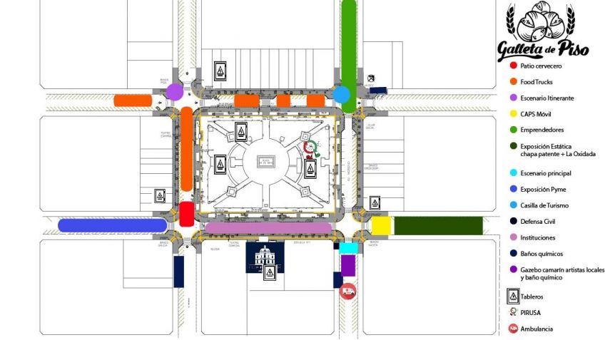 Desde la Municipalidad de Saladillo se dio a conocer el plano de ubicación con los espacios en los que se ubicarán los diferentes stands y servicios el próximo fin de semana del 22 y 23 de abril con centralidad alrededor de la Plaza Principal.