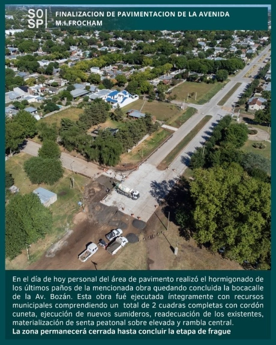 Esta obra fue ejecutada íntegramente con recursos municipales, comprendiendo un total de dos cuadras completas con cordón cuneta, ejecución de nuevos sumideros, readecuación de los existentes, materialización de senda peatonal sobreelevada y rambla central.
