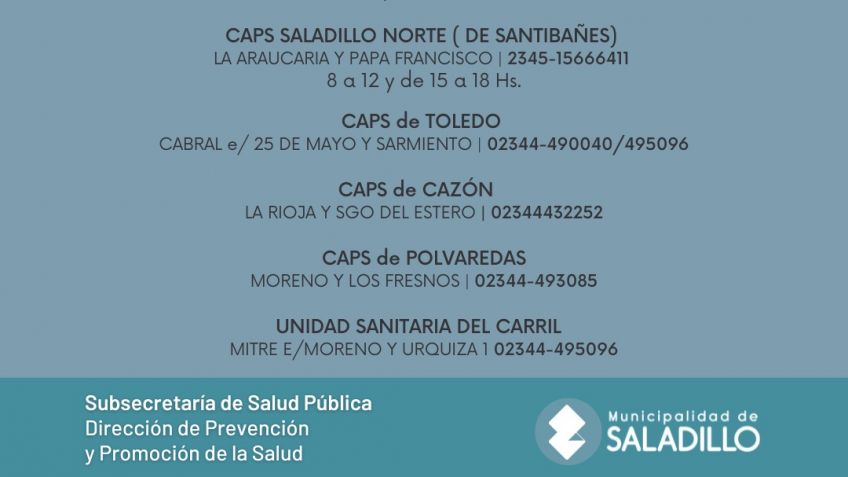 La Subsecretaría de Salud Pública y la Dirección de Prevención y Promoción de la Salud, informan a toda la comunidad los horarios de atención de los CAPS de nuestra ciudad y los servicios gratuitos que los mismos brindan a toda la comunidad.